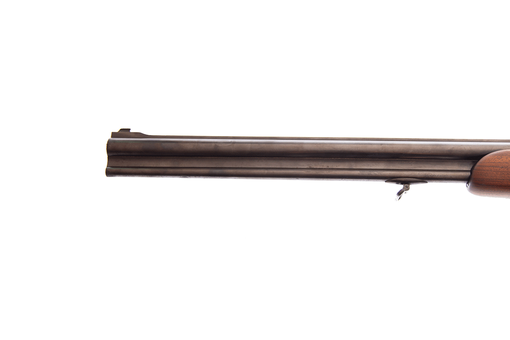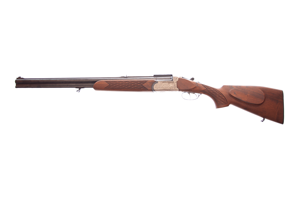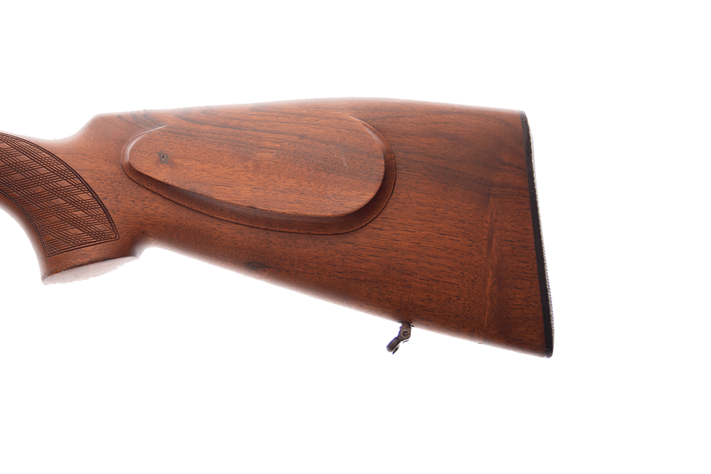 Valnötskolv med skotsk nätskärning. Dubbla avtryckare med kulpipan på främre och snälltryck.