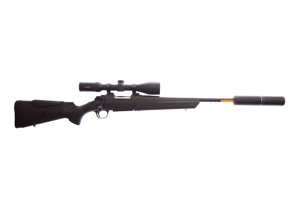 Paket med studsare i syntetkolv inkl. belyst Hawke Vantage 2,5-10x50 samt med ljuddämpare Aimsport Triton No4. Bred framstock medföljer utan extra kostnad.