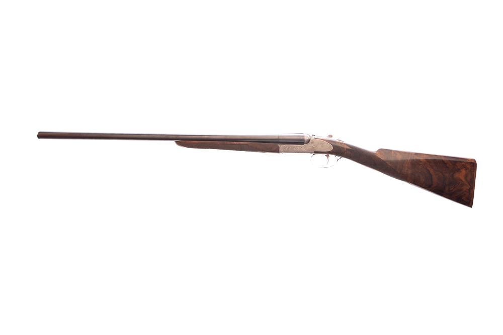 Fin rak engelsk valnöts kolv i Grade 4. Enkeltryck, ejektor och utbytbara chokar. Graverade sidoplattor.