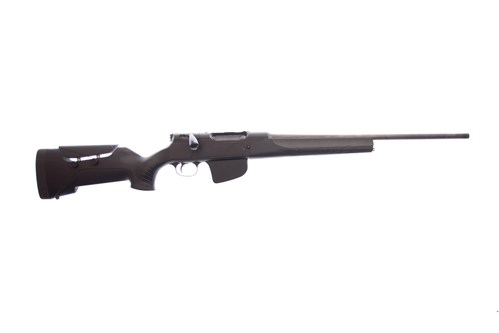 Rakrepeter med fin slutstycksgång. Svart syntetkolv och ställbar kolvkam. Stort 5-skotts magasin. Gängad pipa i M15x1.