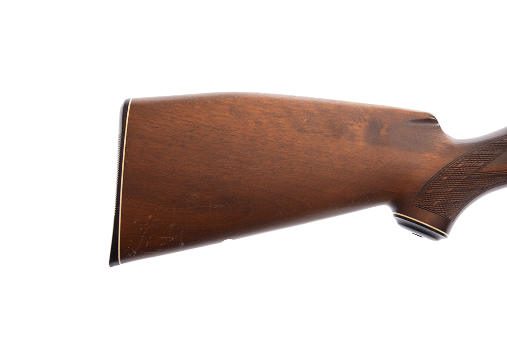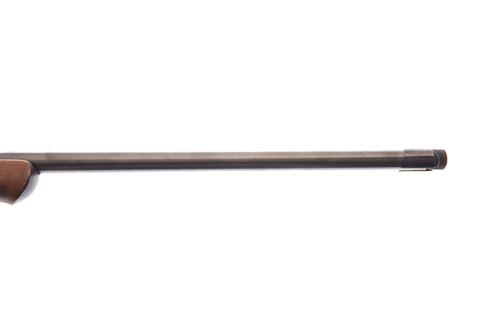 Valnötskolv med kindstöd. Löstagbart magasin. Pipan är gängad för ljuddämpare.