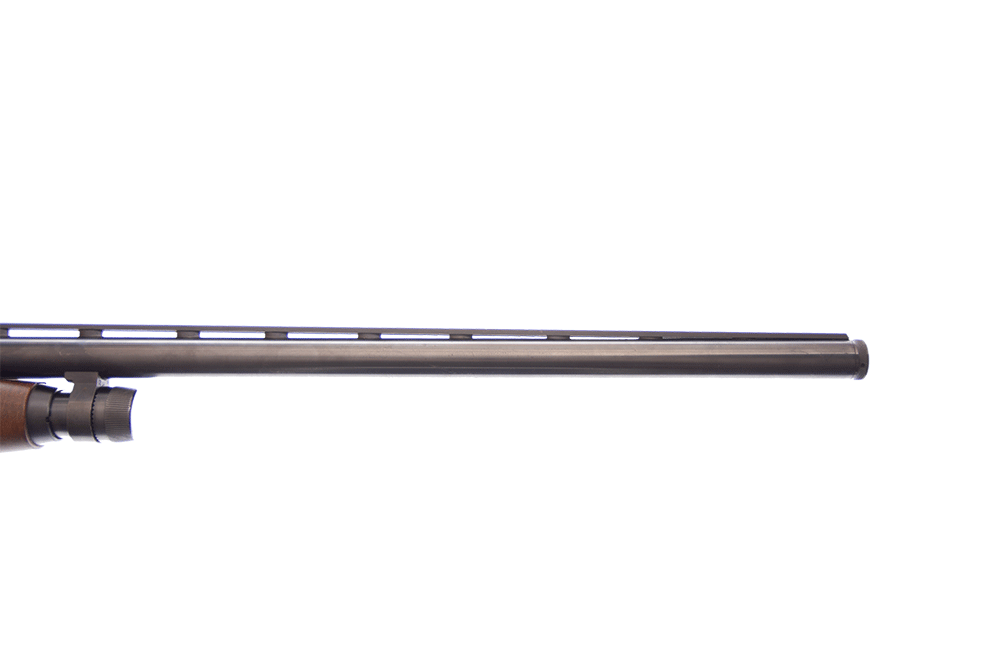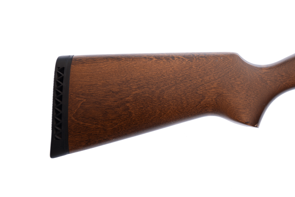 Pumprepeter med utbytbar choke. Träkolv med ventilerad gummibakkappa.